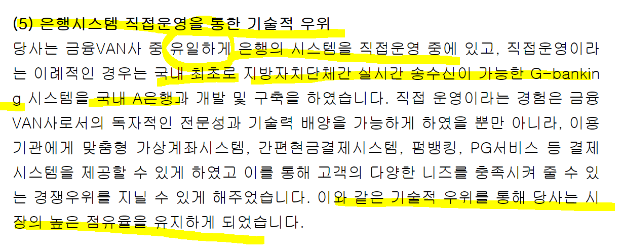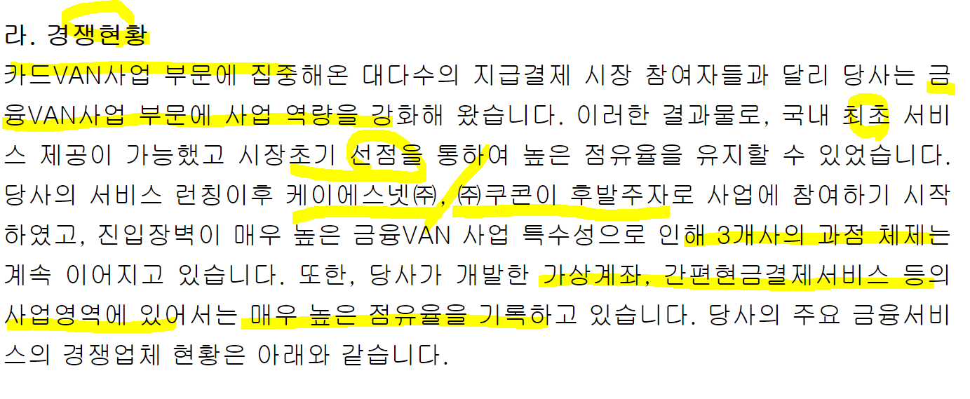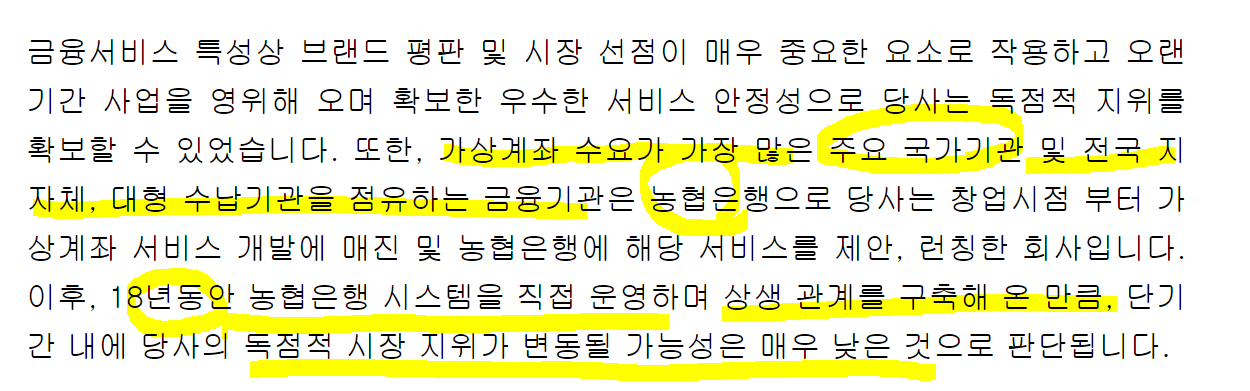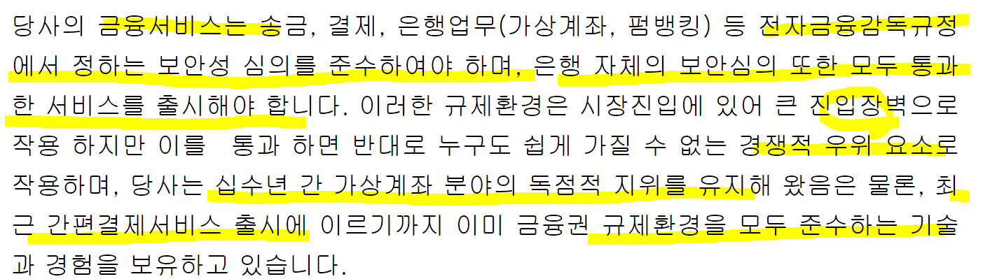 진입장벽. 경쟁적 우위. 가상계좌 분야 독점 1위. 간편결제 서비스 1위.