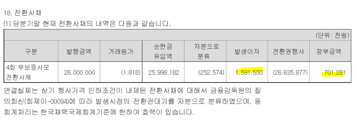 당기 미상환 전환사채 장부금액 증가 6.85억 → 7억. 발생이자 1,500만원.