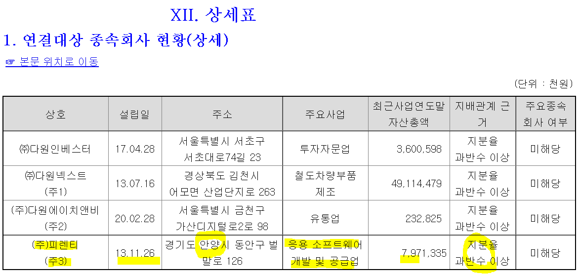다원시스의 종속회사인 (주)다원넥스트의 75% 자회사(손자회사)이다.