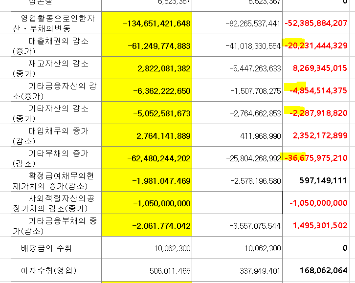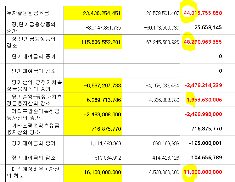 단순하게 생각하면 돈 못 벌어서(CFO) 재산 팔고(CFI) 돈 빌려서(CFF) 막는 상황인데, 수주산업 특성상 계약자산(미청구공사)으로 인한 CFO-로 보이는 효과 있을 수 있으니 자세히 살펴보자.