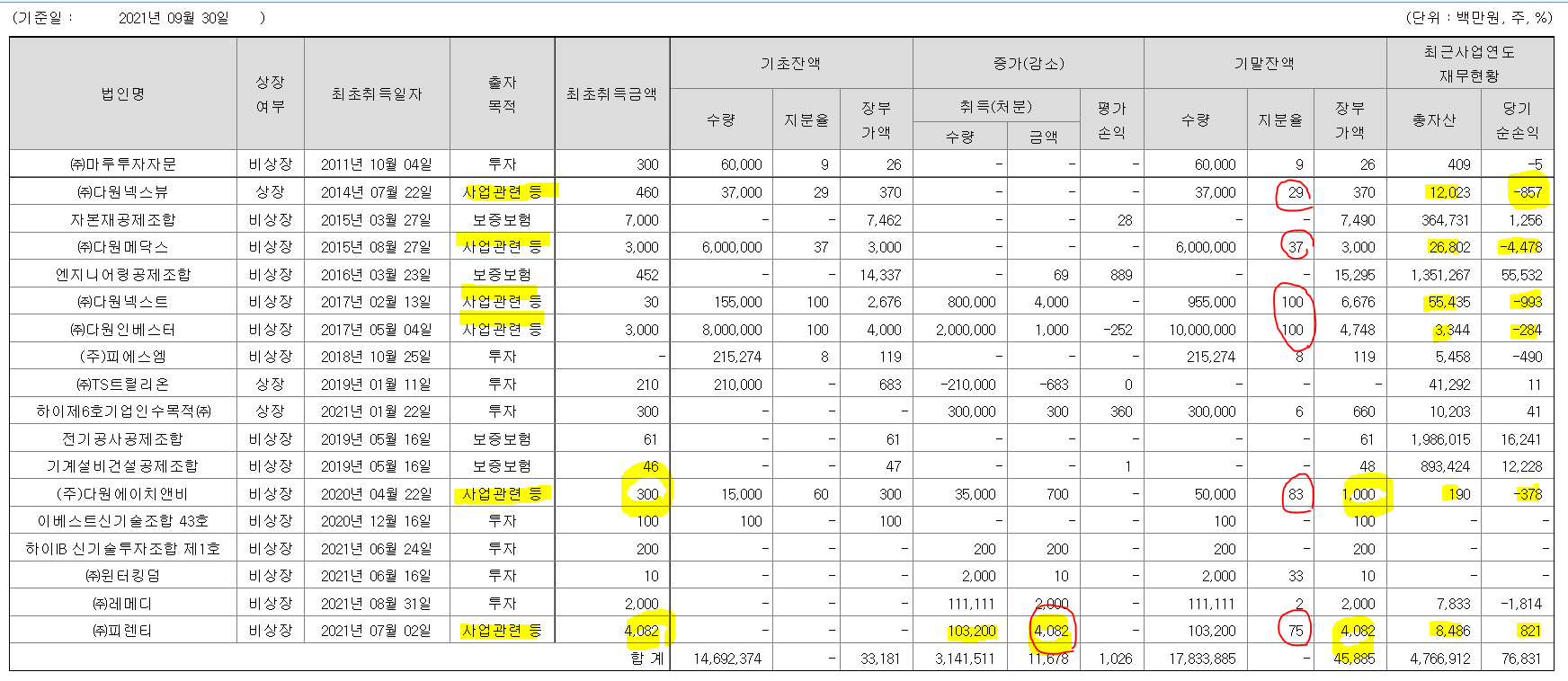 최근 사업연도 재무현황은 말 그대로 2020년도 기준이다. 당기순손익 표시되는 것도 1H21 보고서와 변동사항 없다. 지분율만 보고 가자.