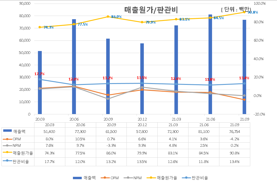 매출원가율 84.5% → 90.8%로 크게 증가한 모습 보인다.