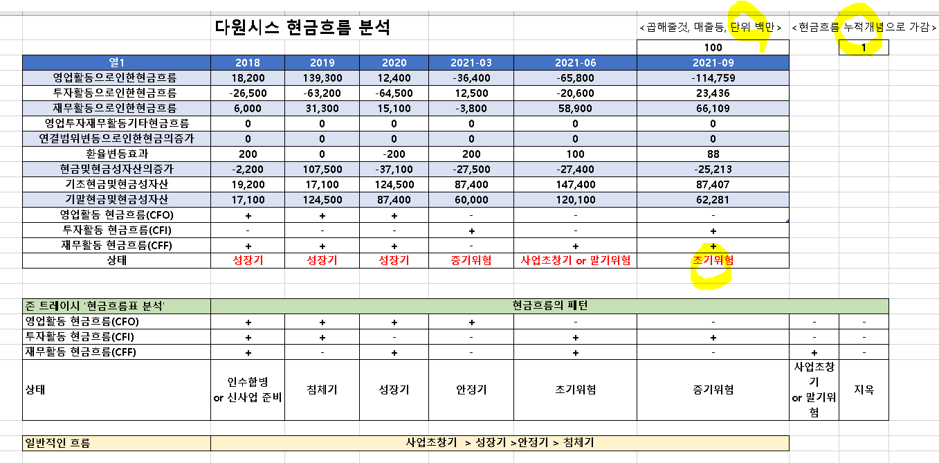 존 트레이시 현금흐름표 분석에 따른 다원시스의 상태를 보면