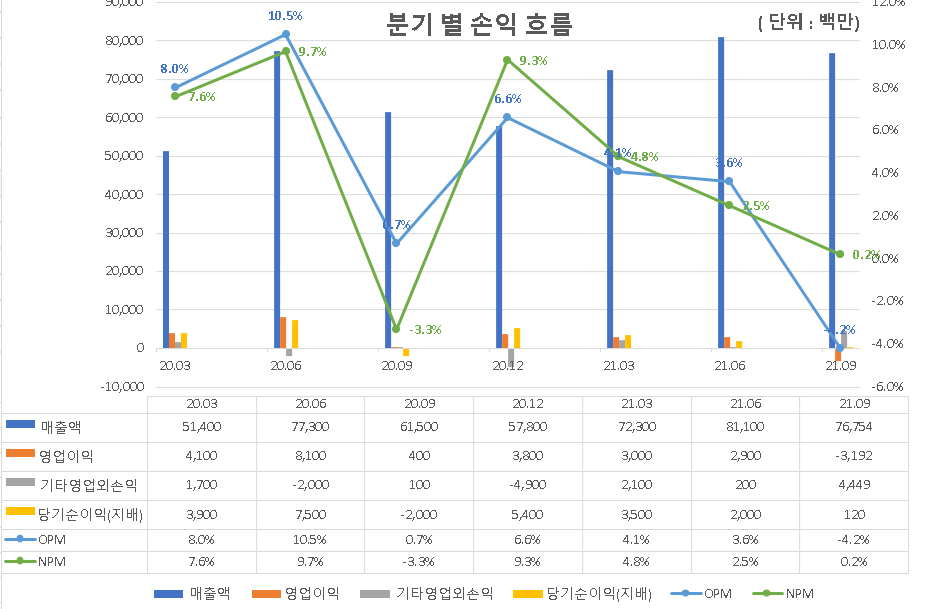 2분기에도 저조했던 OPM 회복되지 않았고, 영업손실을 냈다.