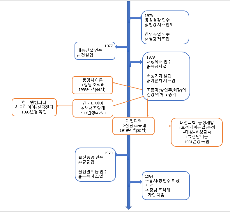 1978년 조홍제 회장의 건강 악화로 사전 승계작업이 이루어 졌다. 형제들간의 갈등을 염려한 조회장은 아들들에게 기업의 주력사업들을 사이좋게 나누어 주었다.