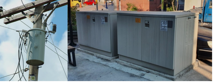 1차변전소에서 받은 전압을 추가 강압 → 주상변압기(전봇대 달린 원통형 기기. 사진 좌.)나 패드변압기(길거리 한전 마크 찍힌 네모 철제 박스. 22,990V를 220/380V로 변압. 사진 우.)가 받을 수 있는 22,900V로 낮추어 배전.