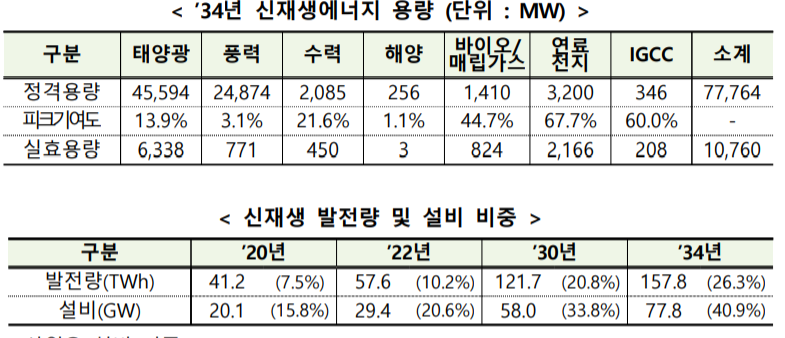34년 목표량 77.8GW 기준 풍력은 24.8GW로 31.8%의 비중을 차지할 것으로 예상됨.