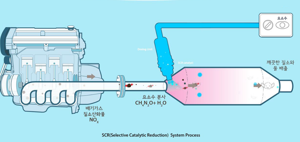 2008년 유럽 배출가스 기준에 따라 대형 화물차 등 고출력 디젤 엔진에 SCR(Selective Catalytic Reduction 선택적 환원 촉매 설비)가 적용됨. SCR을 장착하면 매연이 줄어드는데 질소산화물이 많이 나와 이를 줄이기 위해 요소수를 사용하는 것.