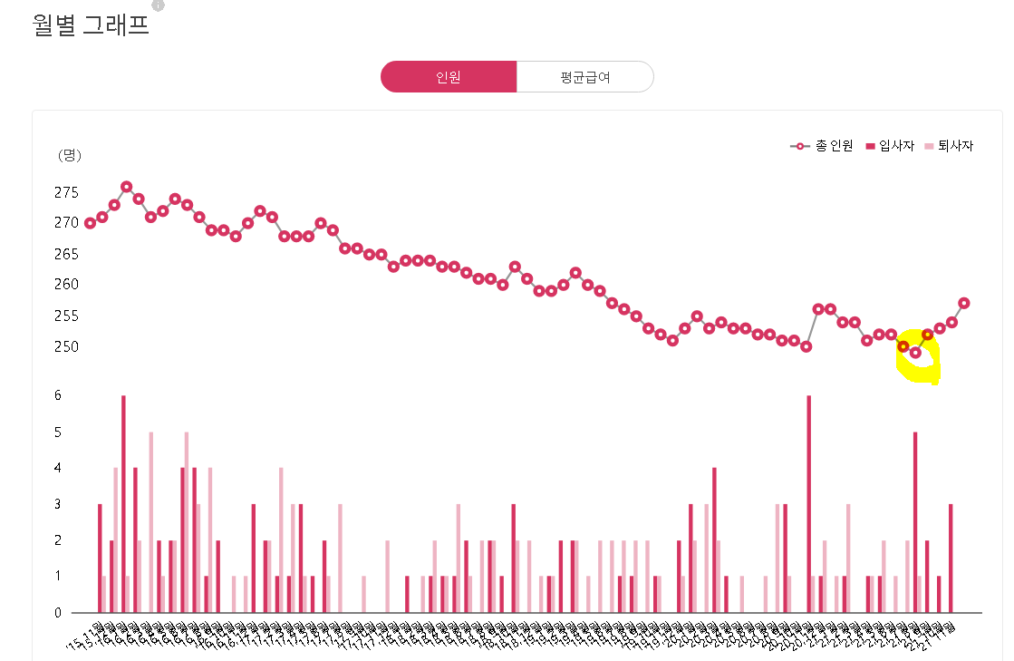 직원 수 우 하향 하다가 21.7. 이후 반등하고 있음.