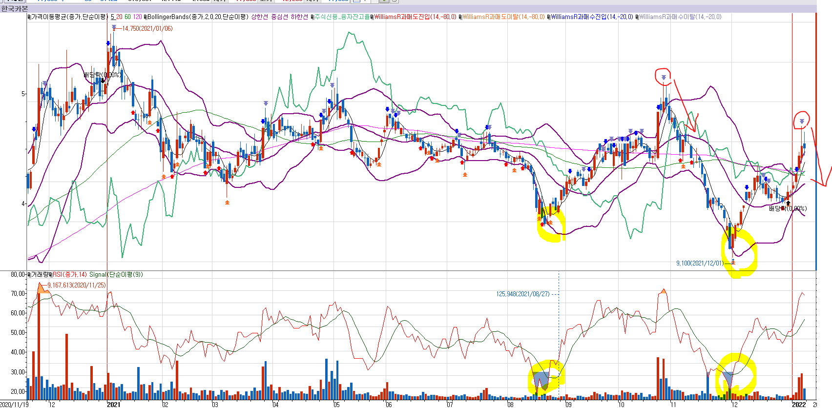 3개월 전 전방산업 호조로 시장의 관심을 받아 상승했다가 다시 하락했으며, 21.12. 과매도 이탈 신호와 함께 다시 유동성이 몰려 상승.