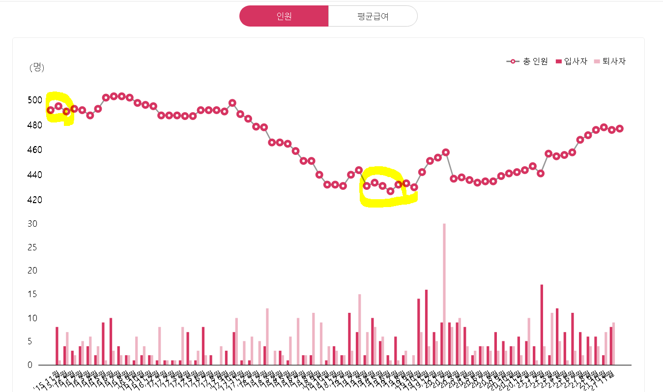 직원 수 15년도 고점 이후 우하향 하다가 19년도 바닥 찍고 반등하고 있군.