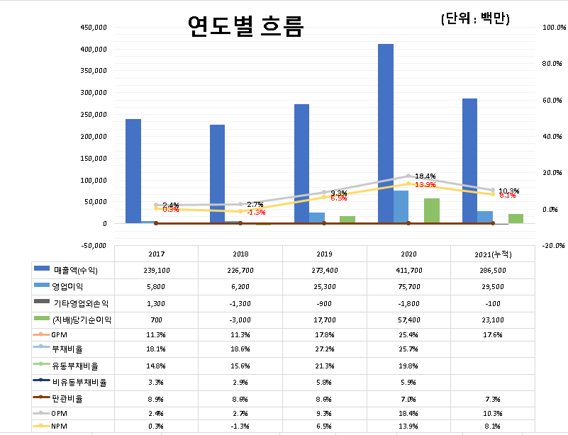 2020. 큰 매출액 성장으로 OPM, NPM 모두 크게 상승. 전년 대비 GPM 크게 상승했는데 규모의 경재로 인한 매출원가 감소로 이익률 상승한 것으로 추정됨.