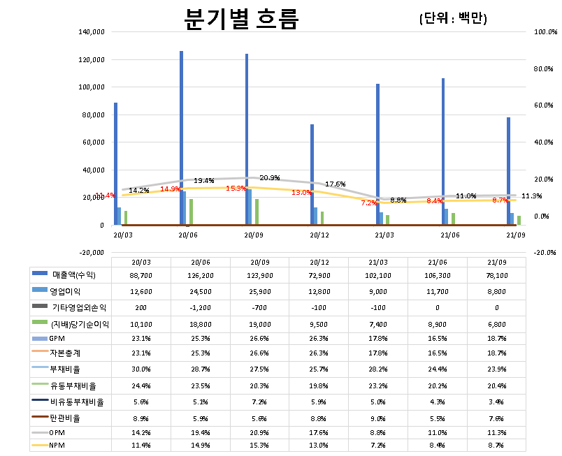 2021(누적). 기저효과로 매출 역성장 전망되고 있으며, 2019년 매출은 넘어섰음. OPM, NPM, GPM 모두 19년도 수준으로 돌아갔음.