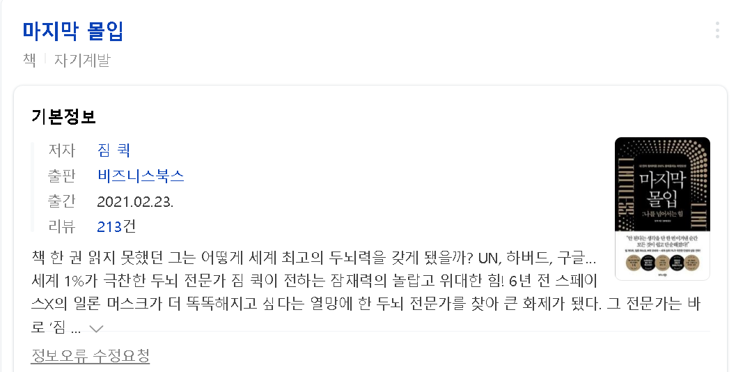 교보도서관(전자도서관)어플에서 '생각'을 키워드로 검색했고, 마지막 몰입(짐 퀵 저)을 읽게 되었다.