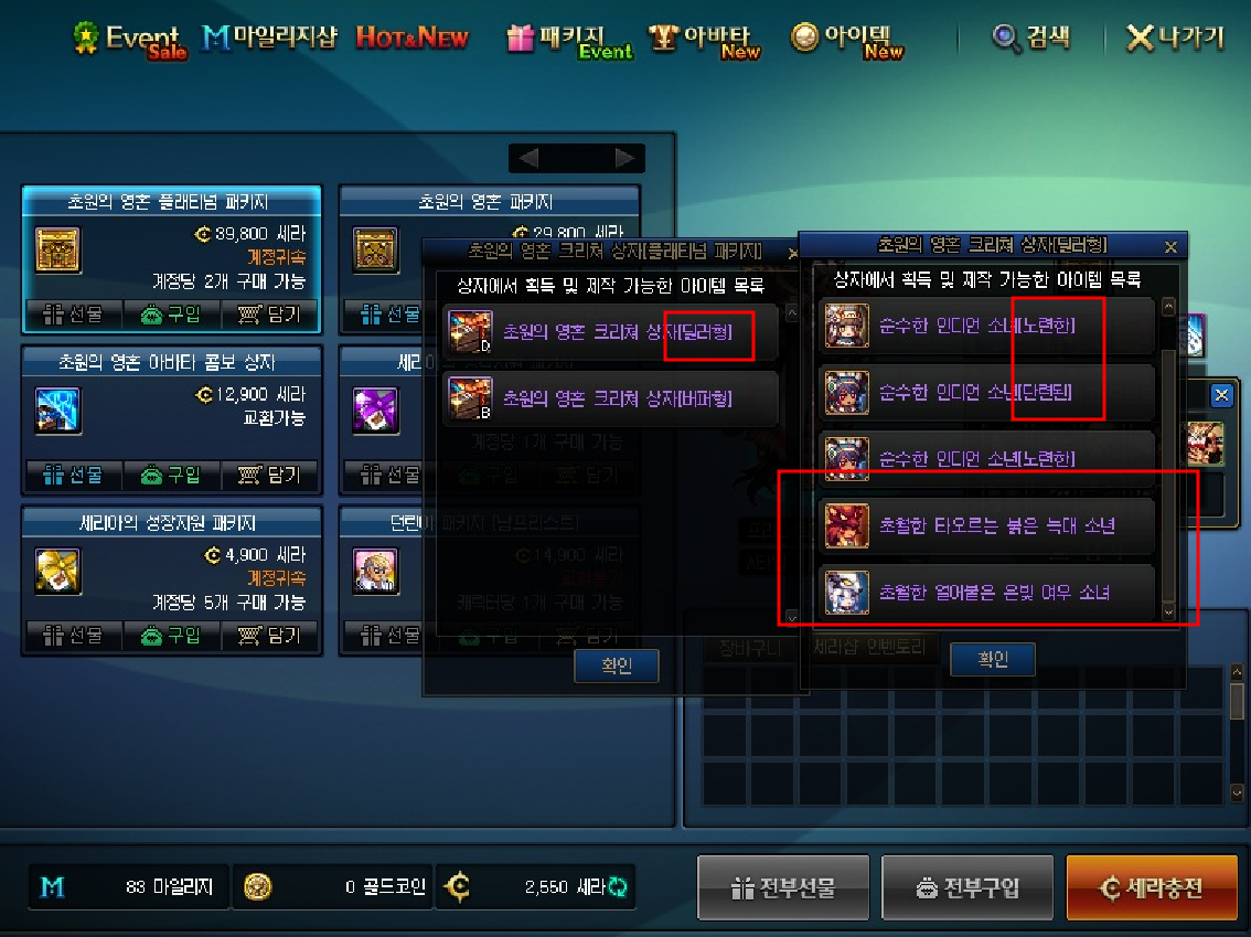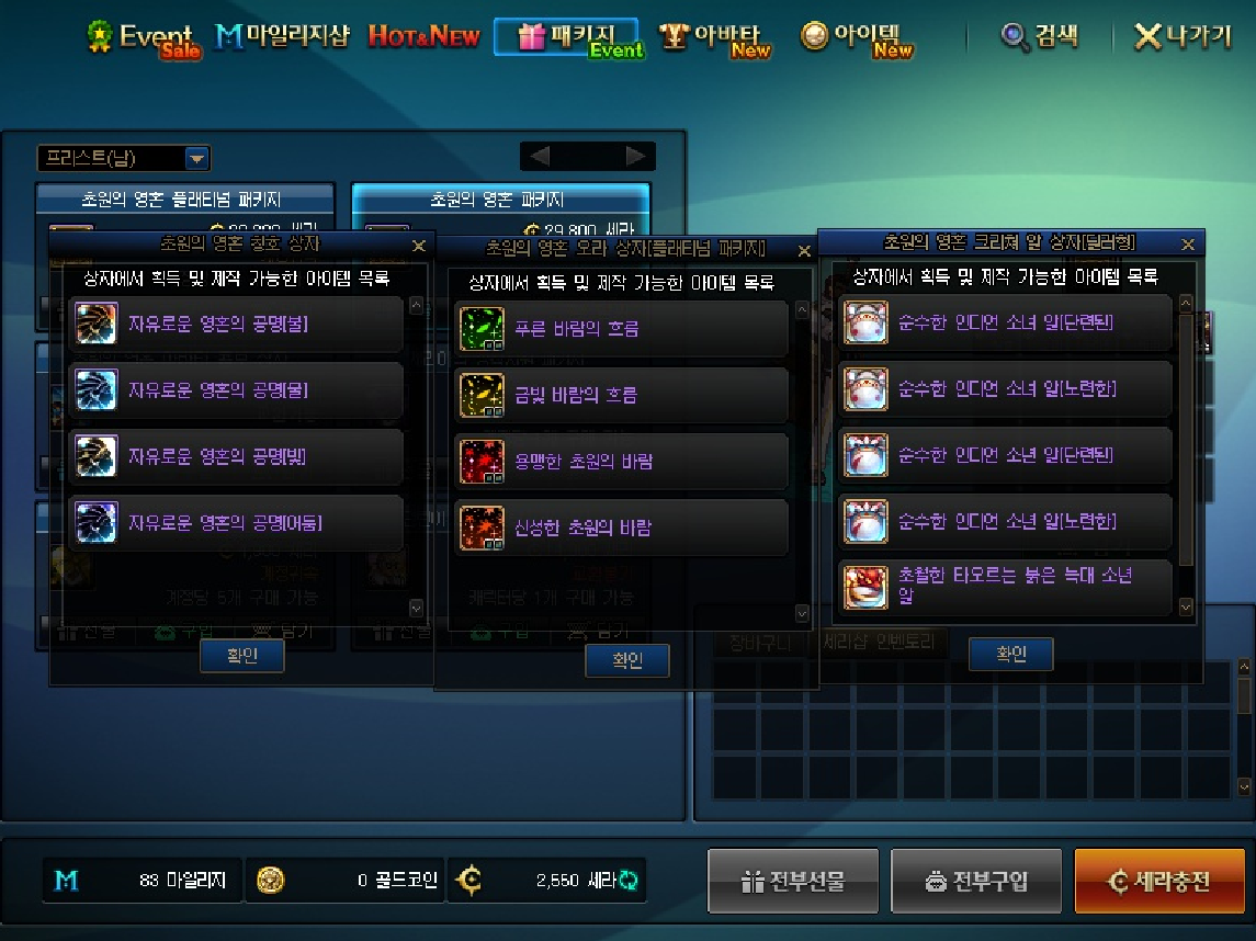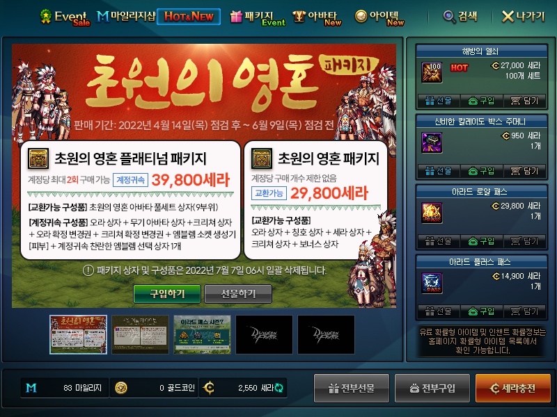 특정 능력치 달성을 위해 여러 재료가 필요한데, 그 재료를 특정 기간 동안 특정한 콘셉트(이번에는 인디언)를 잡고 판매하는 식의 BM임. 현재 판매중인 초원의영혼 패키지는 6.9.까지만 구입 가능. 여러가지 구성 중 핵심 재료는 '칭호', '오라', '크리쳐'임.핵심 재료를 콘셉을 바꿔가며 특정 기간동안 판매하는 시스템.