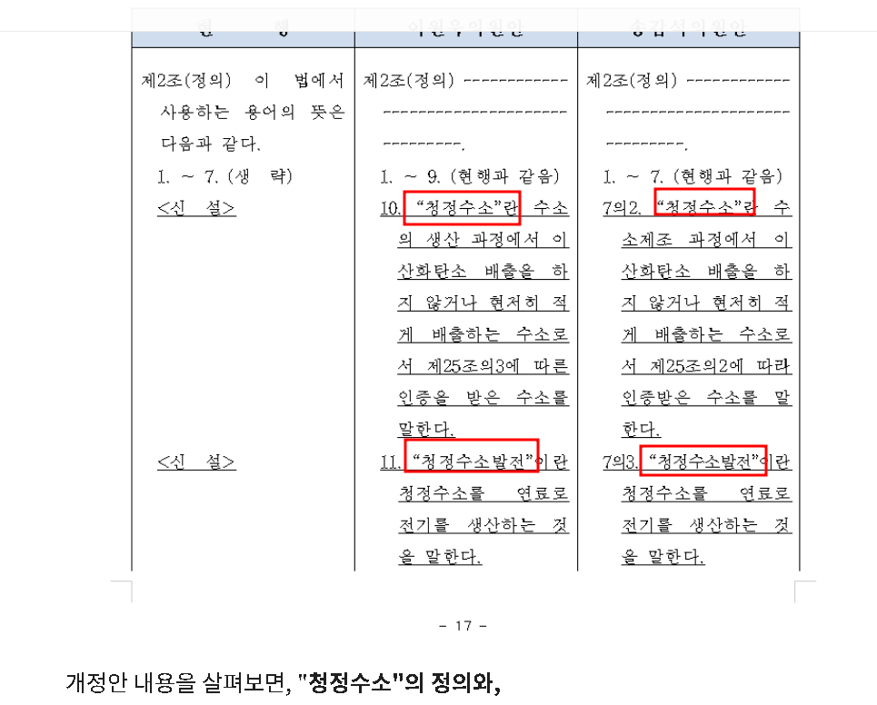 수소법 개정안 내용을 살펴보면 '청정수소'의 정의에 집중함.