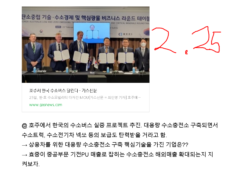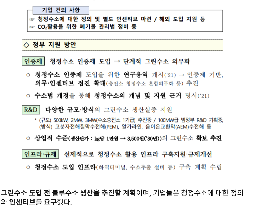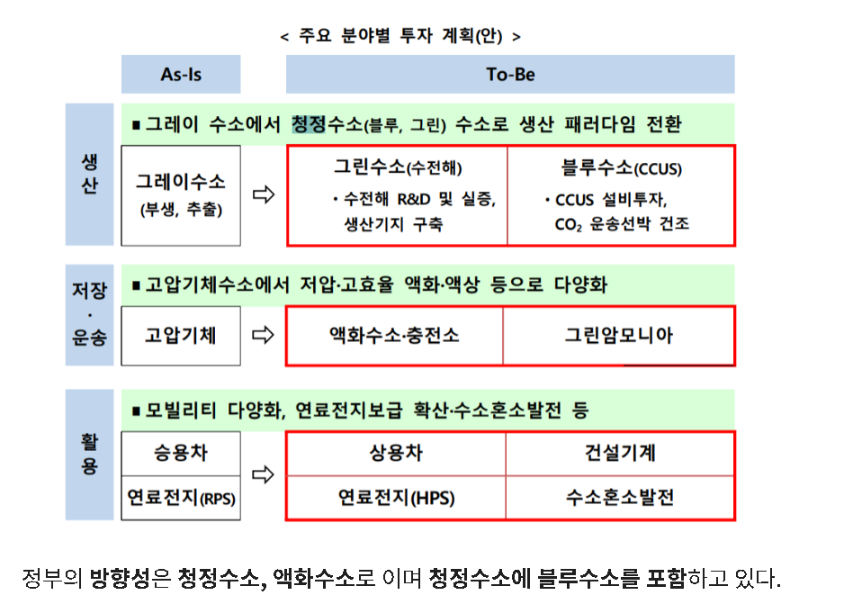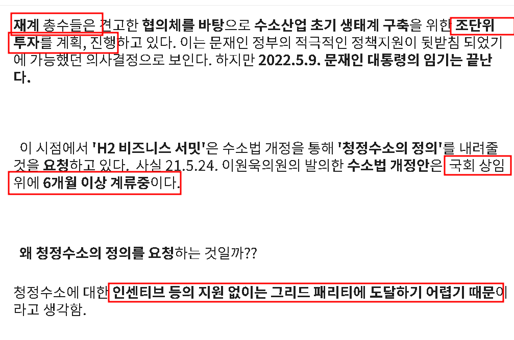 성장성 확실한 수소산업 생태계 구축 및 선점을 위해 재계 총수들은 '조'단위 투자를 약속했었음. 문재인 대통령 임기 끝나기 전에 수소법 개정안 통과를 지속 요구했었는데, 이유는 불확실성 해소임.