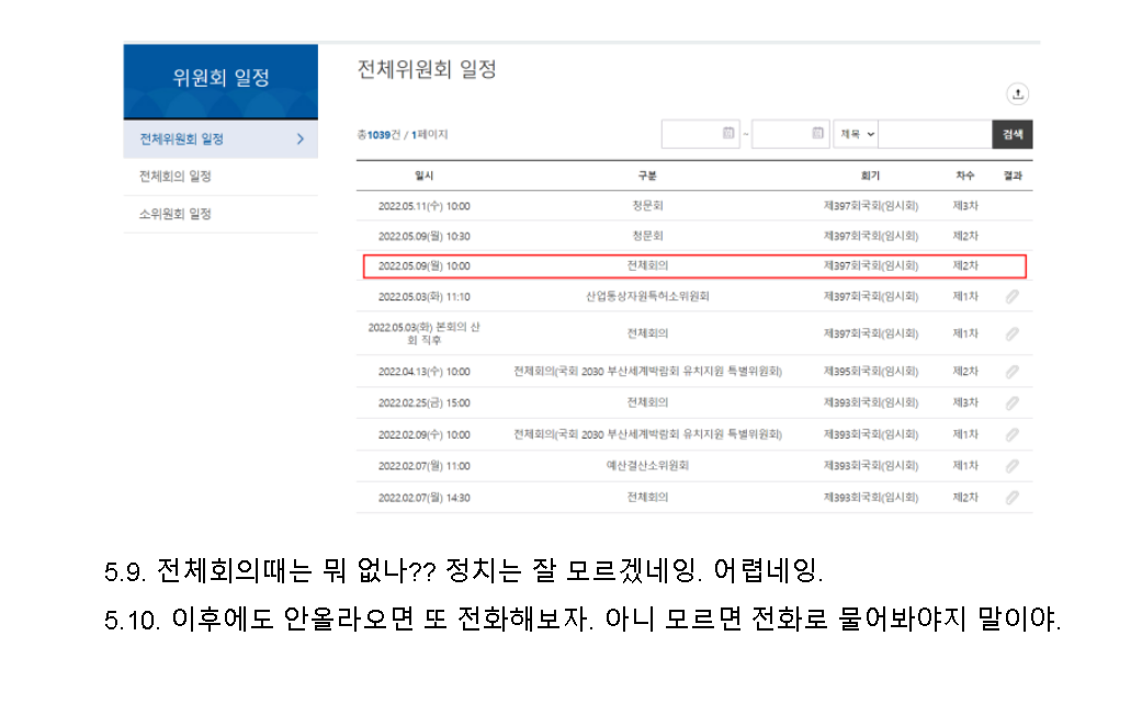 이야~ 5.4. 회의 예정안이네. 아니 예정안 미리 올려야 하는 거 아님?? 참나 ㅋㅋㅋㅋ 아무튼 5.3.에도 회의했는데, 그러면 사전에 여야 다 말 맞추고