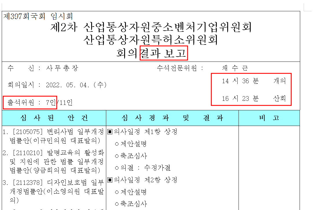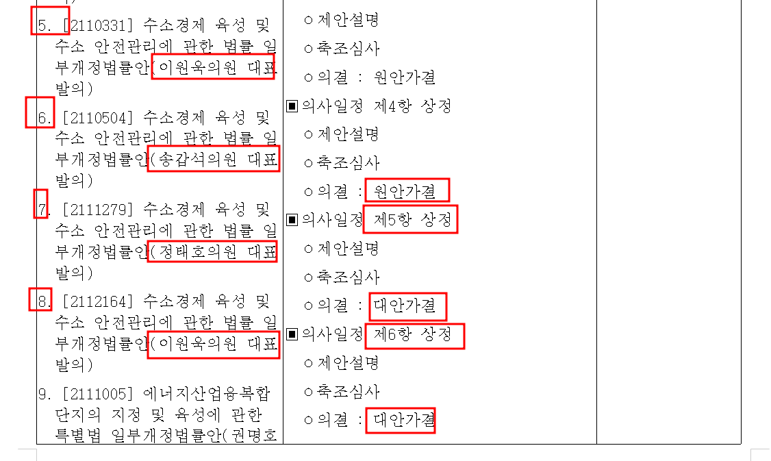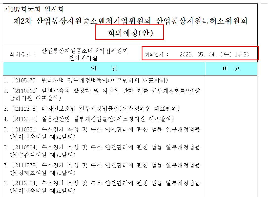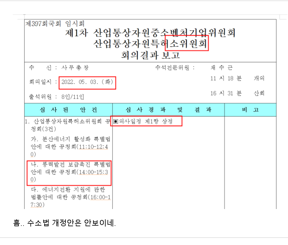 일단위 F/U 하면서, 5.3.까지만 해도 산자위 홈페이지에 올라왔던 회의 결과에는 수소법 개정안 관련 내용이 없었음.