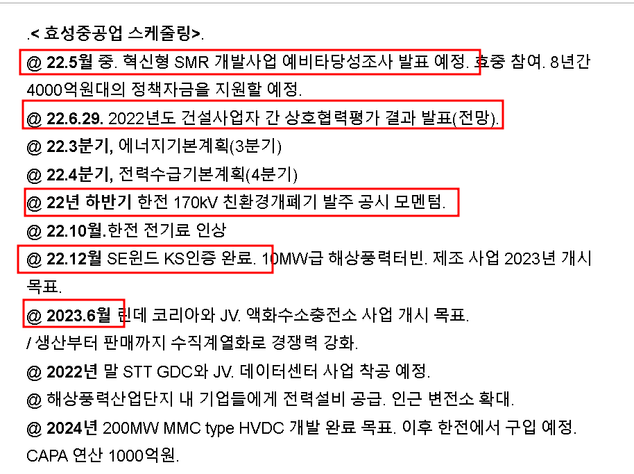 장기적으로는 전남도와 효성중공업이 조단위 MOU맺음. 해상풍력 터빈 공장(SE윈드 JV) 짓고 있고 청정수소도 선점 위해 달리는 중. 다만 2030년 되어야 그리드 패리티 도달 가능하여 장기적으로 봐야함. 현 정부가 원전에 집중한 만큼 단기적으로 해상풍력은 쉬어갈 것으로 보이기에 일단 우리도 하고는 있다 정도로만 기억.