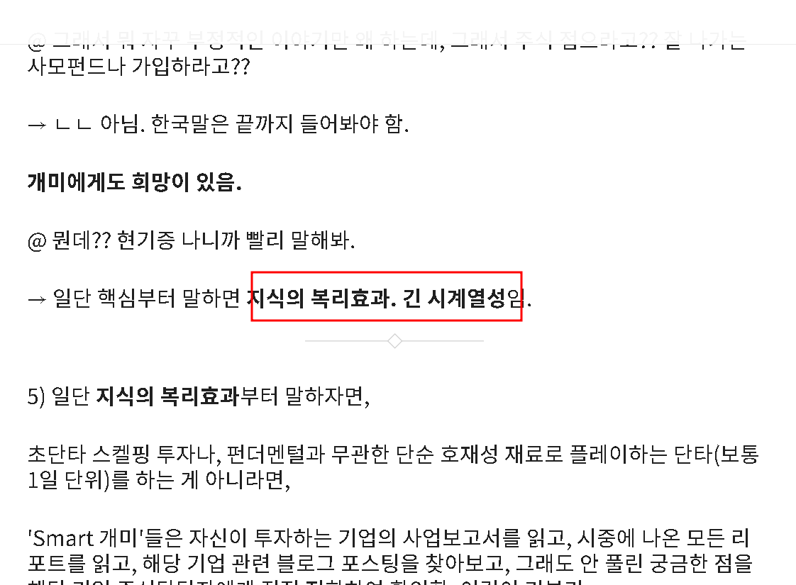 게다가 나도 사실 알고 있음. 개미가 취할 수 있는 성공확률 높은 전략은 긴 시계열성과 지식의 복리효과 즉 장투라는 것을. 답답하고 고집있어서 잘 안 하려고 하는 것일 뿐.