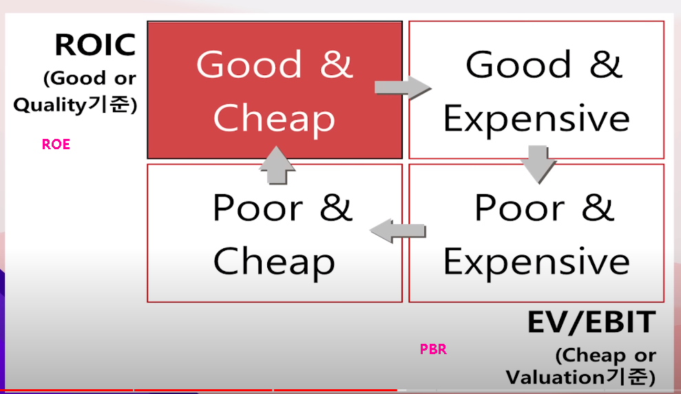 무형자산 중심 사업(서비스업)은 ROIC, EV/EBIT으로 지표를 구하여, 싸고 싸고 좋은 기업(Good & Cheap)을 찾아 성공확률을 높이는 전략임.