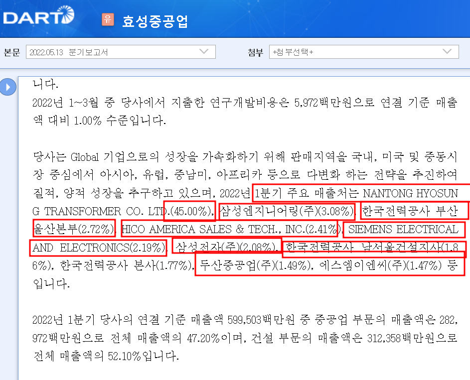 Q1. 효성의 1Q22 주요매출처를 보면 Siemens(지멘스)에도 납품하던데, 지멘스 사는 전력설비 부문에서 글로벌 선진업체 아니냐. 왜 사다 쓰는거냐?? 직접 생산은 마진이 적어서 이제 안 하고 사서 쓰는 거냐???