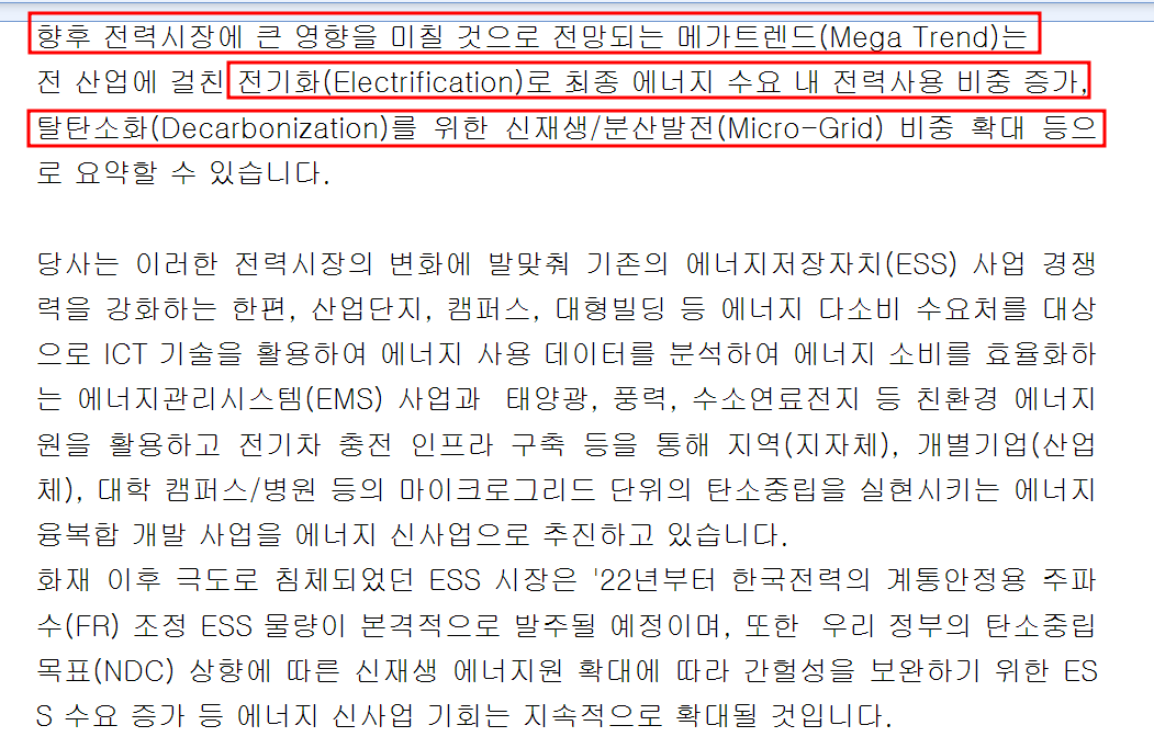 1) 경쟁사 사업보고서와 한전 경영연구원 전력산업 리포트를 통해 대략적으로 전력사업의 방향성에 대해서 체크할 수 있었음.
