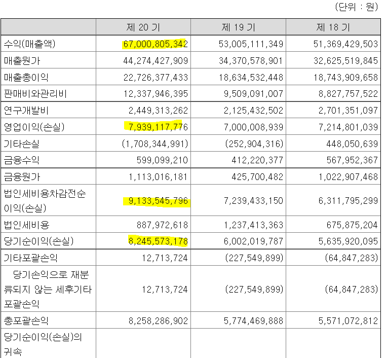 ㅡ20기 매출액/영업이익/법인세비용차감전순이익/당기순이익/지배기업 귀속 당기순이익