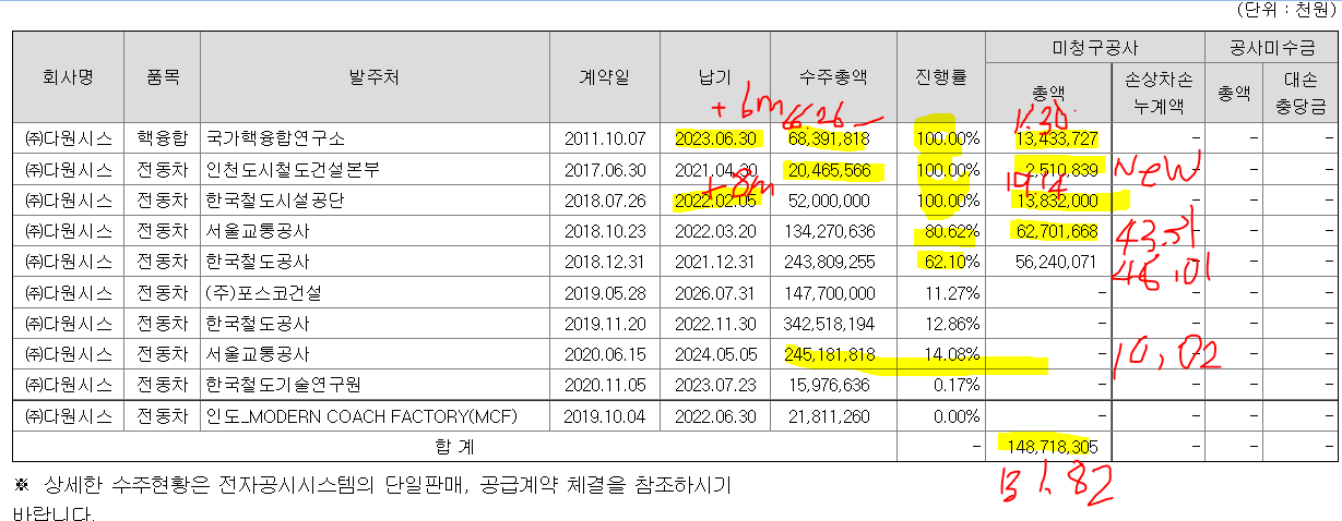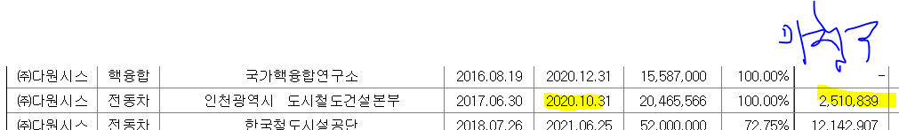 /전동차 품목/인천도시철도건설본부발 계약 진행율 100%. 미청구 공사액 +25.1억 짜리가 갑툭튀했는데,