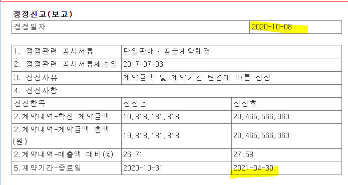 /20.10.8에 수주총액 및 계약기간 변경이 있었는데