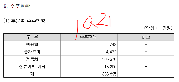 /핵융합 -3억, 플라즈마 +14억, 전동차 -853억, 정류기등 +40억. 눈에띄는 수주잔고 증감량은 보이지 않는다.
