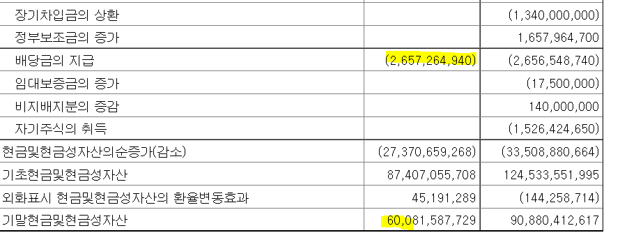 <기초 현금및 현금성자산 874억 -> 기말 600억.>