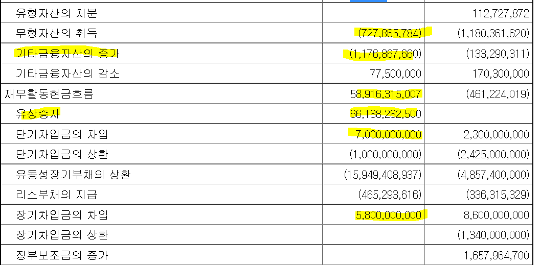 유상증자 0억->661억 증가. 위에서 이미 살펴봤다. 현금증가.