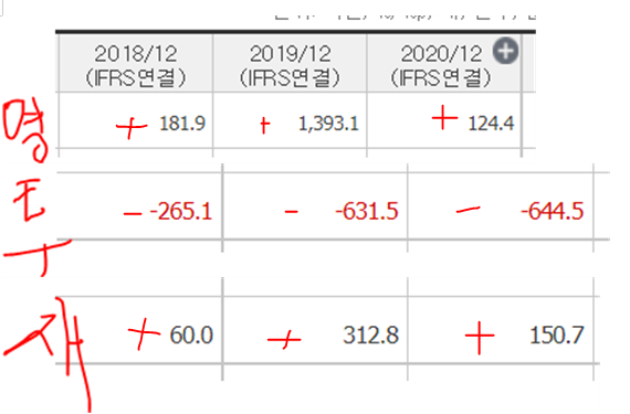 /3년간 +/-/+ 흐름을 유지해 왔는데, 영업 번돈 + 빌린돈으로 사업을 확장하기 위한 투자 형태를 보여왔다.