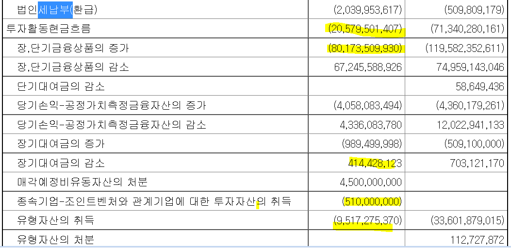 유형자산의 취득 68억 ->95억. 2탄내용. 현금 감소.
