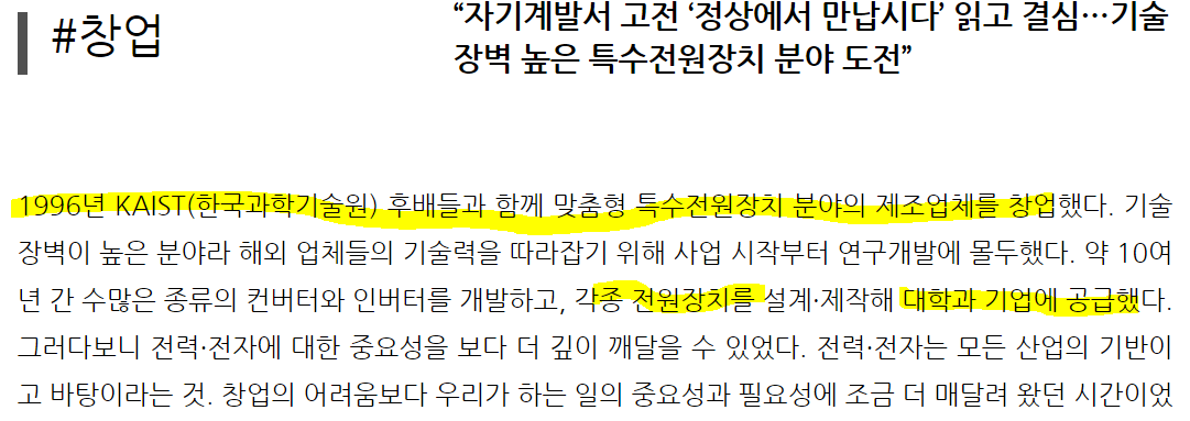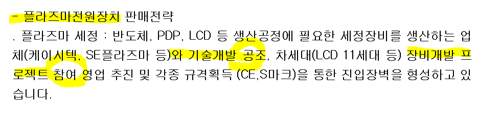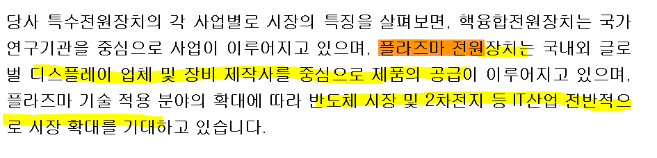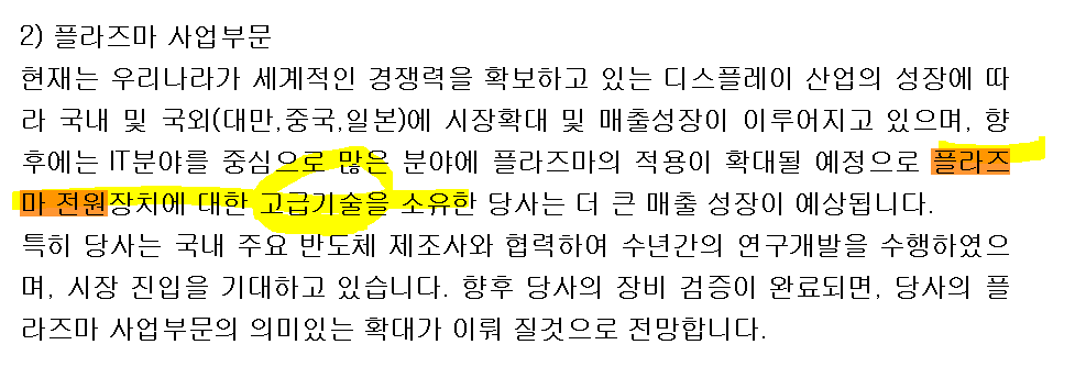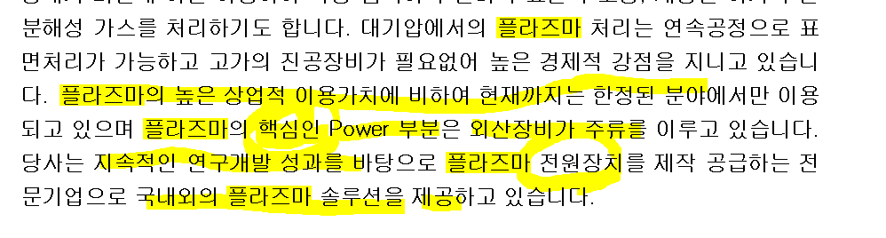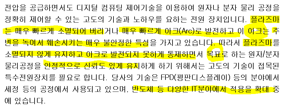 ㅡ 주력 제품이 플라즈마 전원장치라는건데, 플라즈마를 만들고 상태 유지해 주는 것을 말한다.