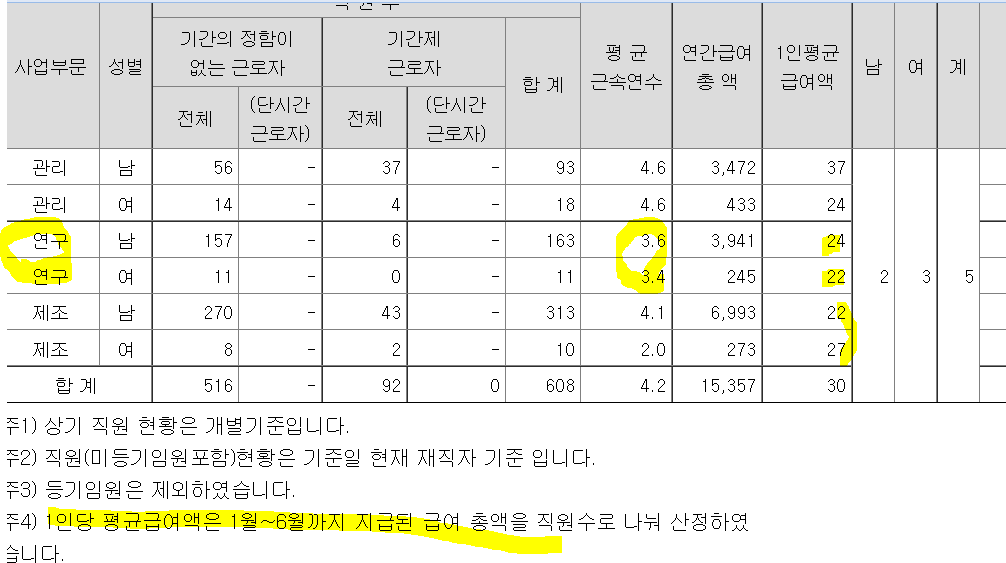 ㅡ 반기보고서상, 직원 등 현황을 보면, 평균근속년수가 길지 않으며, 반기까지 지급한 금액을 봐도 연구직과 제조직 1인 평균 급여약이 큰 차이가 없다. 연구직은 나름 고학력을 요구하여 돈을 더 줘야하는거 아닌가 생각했는데, 내 예상과 달랐다.