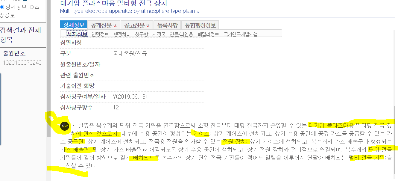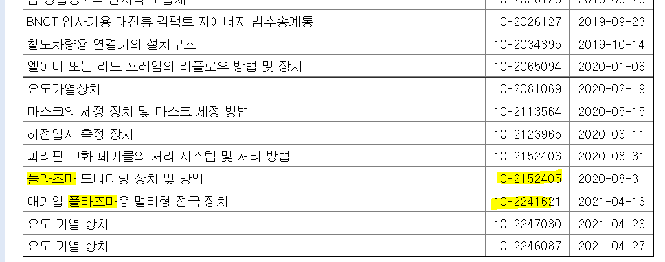 / 오늘 플라즈마 관련 특허를 뒤져보며, 혹시나 타기업과 공동출원(예를들면 삼성전자)한 내역이 있다던지, 내역을 찾아 앞으로 플라즈마 수주 관련 시나리오를 세워보고 싶었다. 하지만 찾을 수 없어 아쉬웠다.