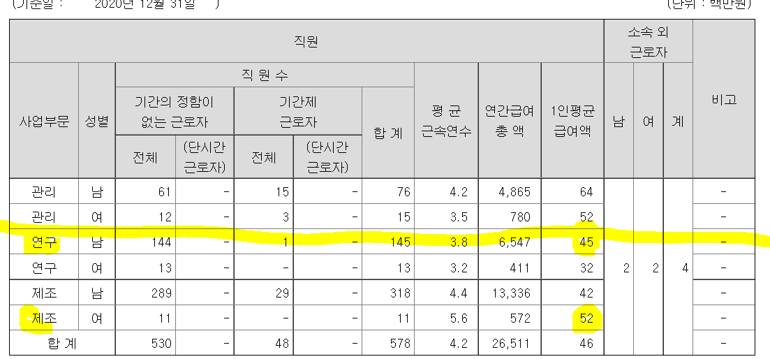 ㅡ 혹시 연말에 더줘서 차이나는거 아니야 라는 생각에 2020 사업보고서를 봤지만, 연구직 여성 1인 평균 급여액보다, 제조업 여성 1인 평균 급여액이 훨씬 큰 것을 확인할 수 있다.