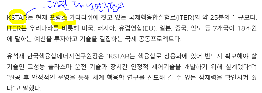 /처음에는 ITER 안에 1/25 규모로 KSTAR가 있고, KSTAR에서 잘 이끌어가면, 공동프로젝트지만, 한국이 선도해 나갈 수 있다는건줄 알았는데, 그게 아니라 ITER는 세계공동이라 프랑스에서 진행되고, KSTAR는 한국대전 대덕연구단지에서 진행되더라.