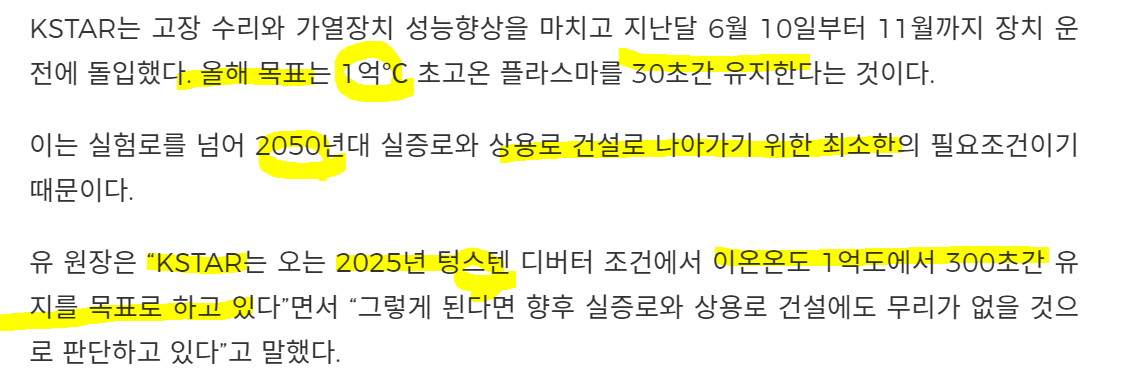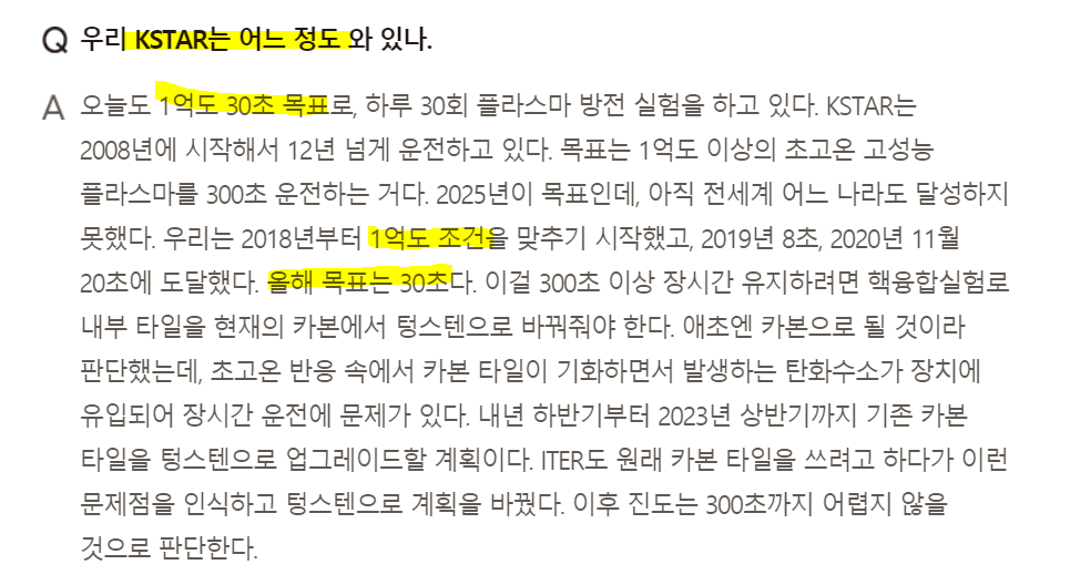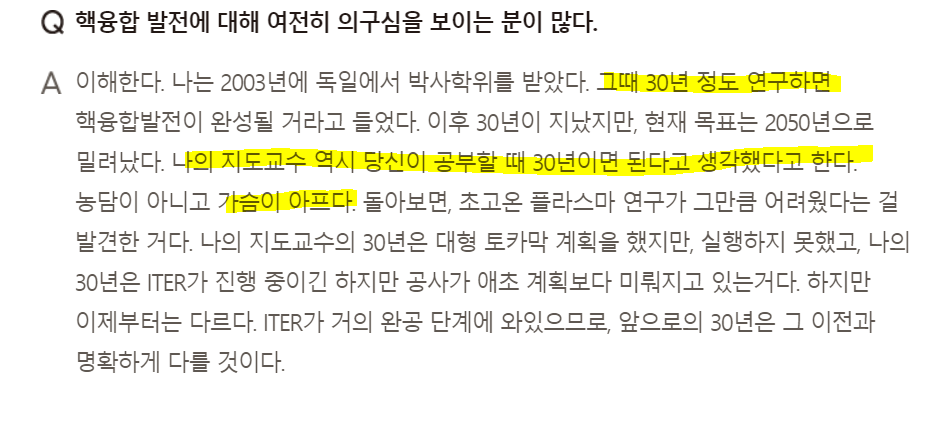 /KSTAR(한국)는 ITER(세계)의 주요일정을 따라가게 되어 있는데, ITER의 기본프로젝트가 2025년에 시작. 35년 목표는 Q10.이라고 함.