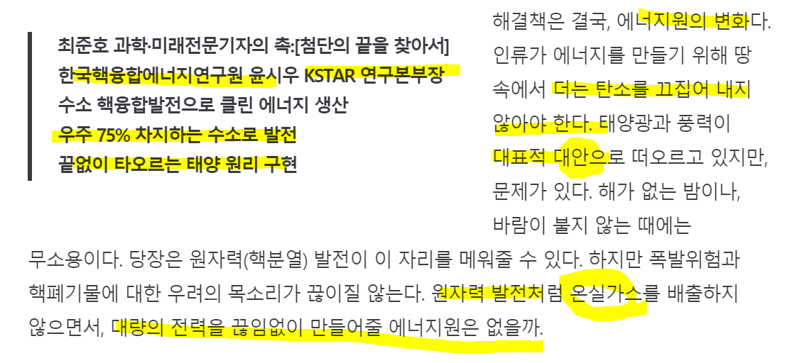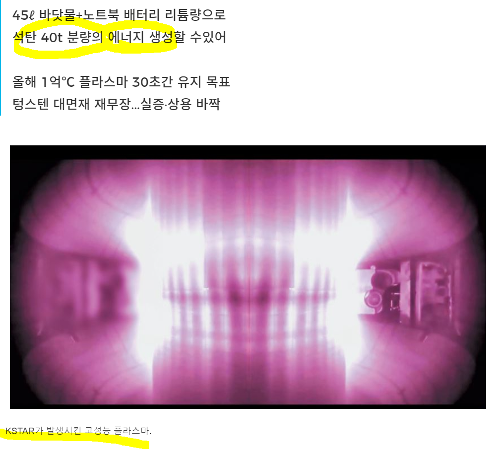 /KSTAR는 전력난 해소를 위해 온실가스 배출 없는 에너지원을 찾다가 시작된 거라는데, 많은 연료(우라늄)도 필요 없고, 방사성 폐기 처리 문제도 없다네.