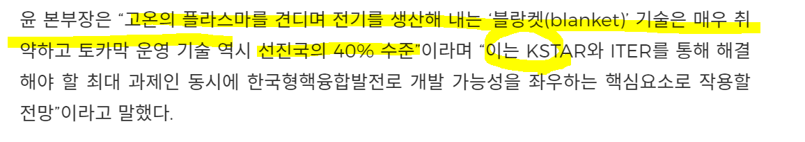 /그렇다면, K전원장치가 인정받아, KSTAR 말고 다른나라에도 공급되고 하면 그때 매출은 늘겟네~ 아까 위에서 [고온의 플라스마를 견디며 전기를 생산해내는 블랑켓 기술과 토카막 운영은 선진국의 40% 수준]이라고 했지만, 미흡하다는 부분은 찾아보니 다원시스가 아닌 다른 공급업체였음(비츠로테크, 이엠코리아 등)
