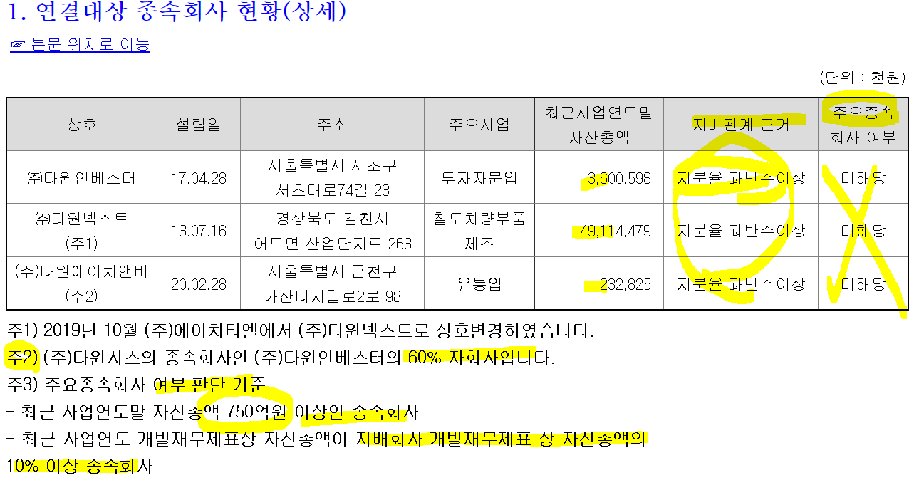 ㅡ잠깐. 타법인출자 현황을 보면, 다원메닥스(비상장), 37.32%지분율이고 다원넥스뷰(상장), 29.31%지분율 인데, 뭐야 왜 얘네는 연결 안 잡힌 거지?? 다원넥스트는 지분율 100%라 당근 잡히는 건데, 나머진 뭐야. 위의 내가 찾아본 기준대로라면, 딱 봐도 30% 이상 소유에 최대 소유인데 머야?? 왜 종속회사 아닌 건데??