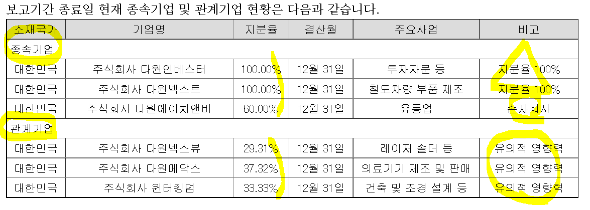 ㅡ 그렇다면 다원메닥스 37.32%, 다원넥스뷰 29.31%이며 관계회사로 재무제표주석에 적어놓은 걸로 보아, 상기한 IFRS 종속회사 기준 /5/, /6/에 해당되지 않는다는 말인데, 재무제표에 표현해 놨는지 찾아보자.