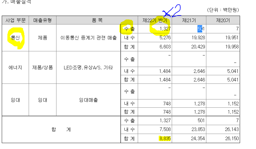 /작년대비 2배로 증가한 통신부문 수출증가 보이나, 내수매출 큰 감소 보이며, 하반기에 개선되는 모습이 피료함*.