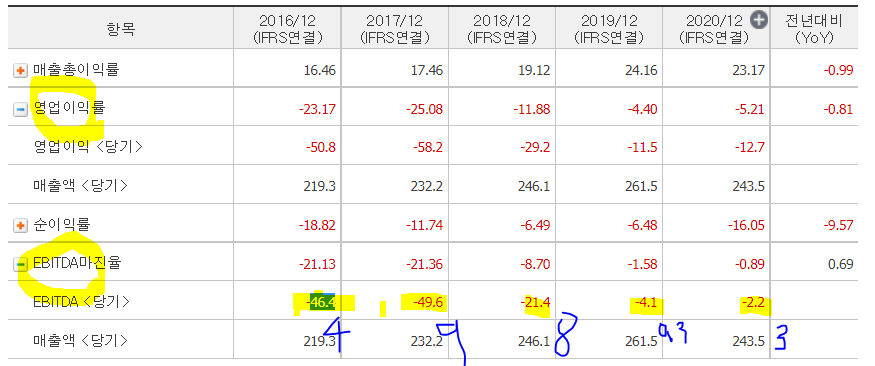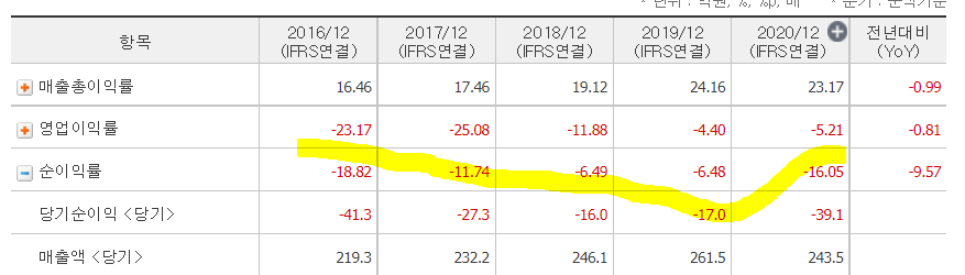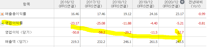 ㅡ당기순손실 감소하는 추세 보이다가, 2020년 다시 크게 증가한 것으로 보아 영업외 손실이 발생한 것으로 보인다.