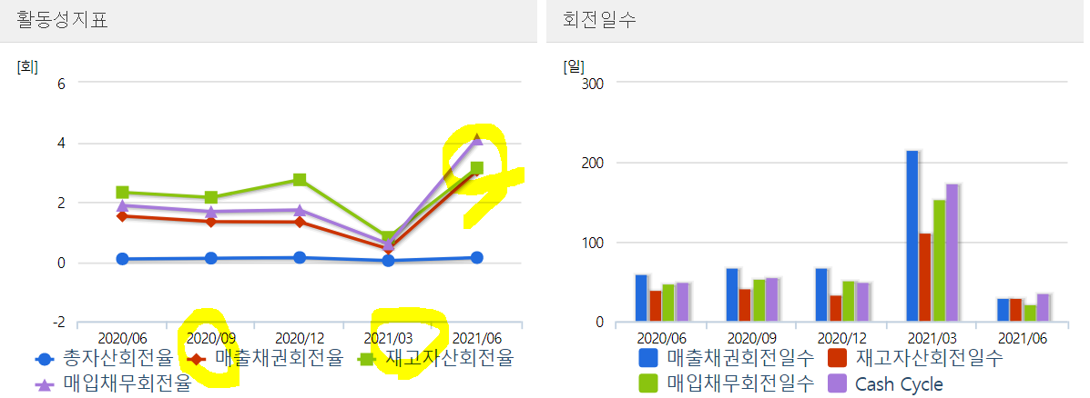 ㅡ매출채권 회전율 및 재고자산 회전율 2분기 3회로 회복되었으나 아직 낮은 편.