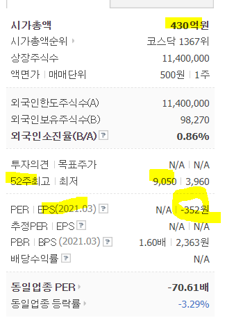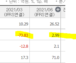 /1분기 EPS -352원으로 당기순손실 냈음을 알 수 있다.